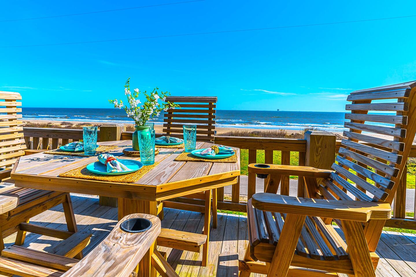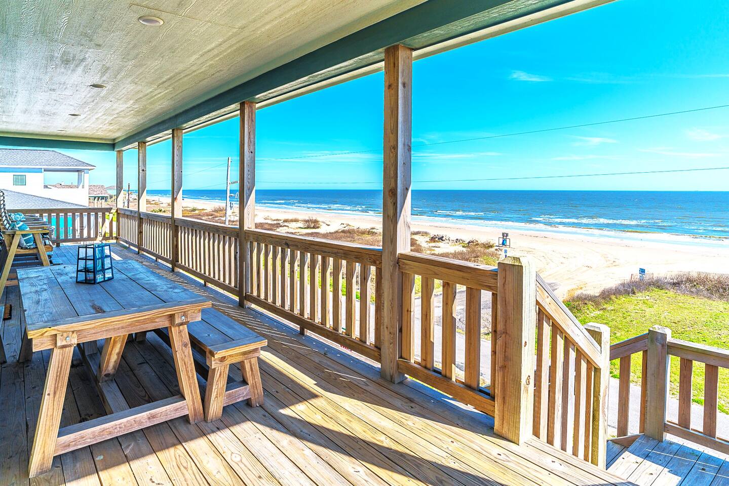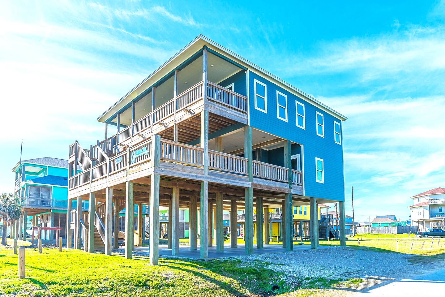 You will love this place. There are many unique amenities that you won’t find with others. This beachfront home has unobstructed views of the ocean from both the top and middle decks to enjoy every sunrise. Crystal Beach is only a few steps away with walking and vehicle access so you can bring all of the necessities to the beach with you. This is one of the top spots in all of Crystal Beach because of the location. Starting from the top down, the kitchen bolsters all of the essentials to cook great meals for your family. From the stainless steel appliances to the commercial grade ice maker. Everything is top notch. The living room is situated with an open floor plan adjacent to the kitchen and has all of your entertainment needs ready for you when you are. Just outside of the living room and kitchen is the upper level deck, with a variety of seating choices to enjoy the morning coffee with the new day. Going back inside, move past the kitchen and you will find the Master Suite. The Master is outfitted with a King Bed and a mounted Smart TV. The Master Bathroom includes a His/Hers sink setup as well as both a whirlpool tub and walk-in shower with a large Master closet. The 2nd Bedroom or the “Seahorse Room'' comes with a King sized bed and a mounted Smart TV. This room also has its own private bathroom with a tub/shower. There is also a washer and dryer set on this level for your convenience. The middle level deck is where everyone tends to congregate. With a variety of seating and lounging including a large entertainment bar, breakfast table, with lounge chairs, you can imagine why it is so popular! On the middle level, the “Ahoy! Room,” the 3rd bedroom comes with a Queen bed and mounted Smart TV as well as a private bathroom with a walk-in shower. This bathroom has direct access to the middle level deck. The “Mermaid Room,” or the 4th bedroom is a bunk room with 4 beautiful built-in bunk beds and is equipped with a mounted Smart TV. Attached is a “Jack and Jill” bathroom with a walk-in shower shared with the 5th bedroom or the “Turtle Room.” This room is equipped with a mounted Smart TV. *Highlights* -Sleeps 12 in beds (2 extra available on the couch) -Linens are included for beds, couch not included, and sanitized/wrapped before each guest stay, and will be placed on the foot of each bed and in the entryway in the linen bag, ready to be placed on beds. This is for your safety, and peace of mind. -Extra blankets -Dog Friendly up to 45lbs. $75 non refundable security deposit for each booking. 2 Dog Max. Must be approved first. -Beachfront -Vehicle Access to beach (annual beach pass visible on windshield) -Outdoor Shower and water hoses -WiFi included -Smart TVs throughout -Charcoal grill included on ground floor -Washer and Dryer included -Several Board/Card games included -Kitchen is equipped with oven, microwave, gas range, toaster, drip coffee, cutlery, baking sheets, pots, pans, dishwasher, a 40 bottle wine cooler and much more -Equipped with silverware and all place settings for adults and plastic for the little ones -Deck Furniture for your use - note the fire pit and hammock on the 1st deck are not available for guest use -High tops and picnic table below for entertaining -Guidebook to make the most out of your stay with us! Also included are: -All Sheets for beds, couch not included, and Kitchen & Bath Towels (sanitized/wrapped before each guest stay and for home use, sheets ready to be placed on beds). -Shampoo, Conditioner, and Body Wash -Trash Bags -Toilet Paper (2 rolls per bathroom) -1 Paper Towel roll -Basic Cooking Consumables (Salt, Pepper, Oil) -Laundry Detergent Here's the basic rules (see house rules section for detailed explanation): Check-in: after 4:00PM Check-out: before 10:00 AM Early Check-in and Late Check-out are not available due to cleaning, sanitizing and maintenance schedules. Our cleaners are grateful! *Crystal Key is on a septic system and therefore, nothing except toilet paper can be used in the toilets, including extra foods from meals. Please dispose in the garbage first. *The minimum renting age is 25 years old. *We are dog friendly. We have a 45lb/dog, 2 dog MAX policy. No dogs are allowed on the furniture, beds, etc. Many will bring dog beds and crates for their furry friends! For full rules, see house rules, and policies. All Texas Coast homes are built off the ground. It is important to note that guests must be able to climb stairs. Important to note that all coastal regions have the chance for weather disturbances. Due to this it is highly suggested to use a 3rd party rental insurance for your stay. We suggest TravelInsurance, The General or through AirBnB. They offer rates from 7-10% of booking cost in order to ensure that you are covered in the event that there are sudden weather changes. Basic House Rules: We love hosting and we love our guests! Please abide by these rules. Full disclosures can be found on the listing website 1. Wash all sandy feet and hands after a beach visit prior to entering the home. We have provided an outdoor shower and water hoses. 2. Take your shoes off....and stay a while. No shoes is a great beach policy anyway! 3. Woof! No pets on any furniture. Pet's love their own beds and crates give a place of comfort in unfamiliar territory. (MAX 2) 4. All pets MUST have their left-overs removed from the yard, bagged, and placed in a garbage with a liner. 5. We are on a septic system. Nothing except toilet paper can be flushed. All excess food needs to be put in the trash before washing dishes. 6. No parties or events unless arrangements are made with the host prior to the reservation 7. No Smoking in the house. All cigarette butts must be placed in the garbage can downstairs with a garbage liner. 8. Do not move the grill to another floor. 9. Do not climb on or over any railings. 10. Do not move any indoor furniture outside, and any outdoor furniture inside. 11. Make sure you park in the designated areas on